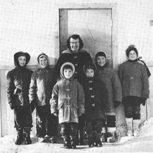 Taken in front of the Moak Lake schoolhouse, this iconic photo shows teacher Eunice McGinnis flanked by her students. From left to right: John Crandall, Rick Hess, Sheilah & Sarah Crandall, Mary Beth Hess, and Hugh J. Fraser (who still resides with his family in the Thompson area).