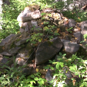 All that visibly remains of the historic site is the base of a once towering, double-hearth stone chimney that was held together with sticks and clay mortar, now reduced to piles of rubble.